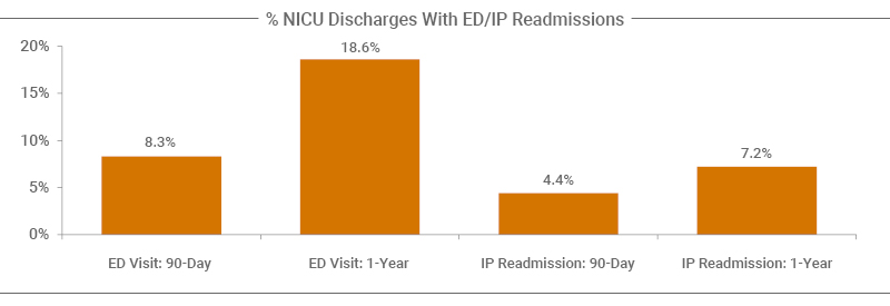 Postdischarge utilization was common among infants who received NICU services, and it persisted well beyond the initial hospitalization. Within 90 days of discharge, 8.3% had an ED visit and 4.4% experienced an inpatient readmission. By one year, these rates rose to 18.6% for ED visits and 7.2% for inpatient readmissions, meaning nearly one in four infants receiving NICU services returned for hospital-based care within one year of discharge.